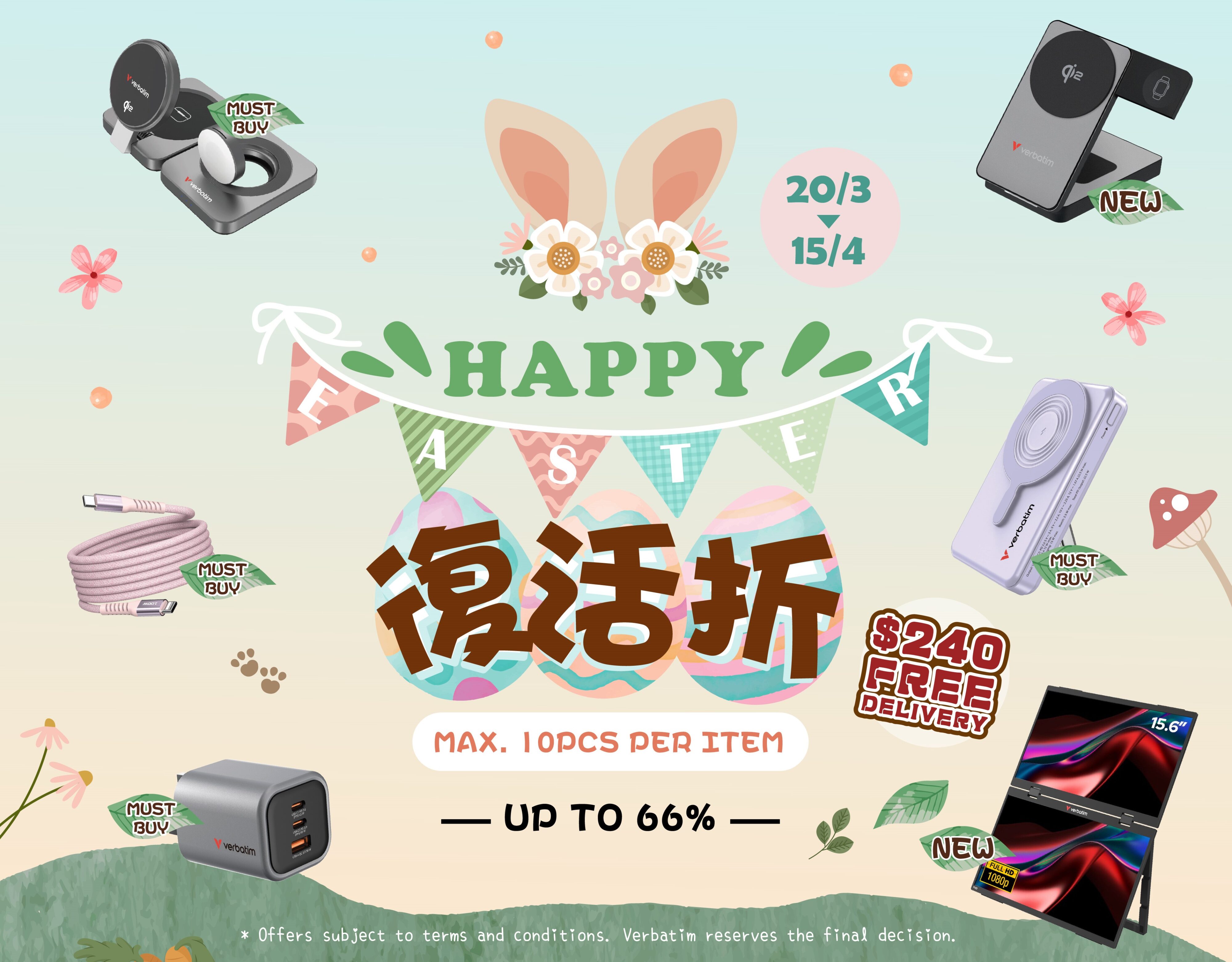 嚟緊嘅復活節長假✨,計劃好行程未呢? 📅3月20日至4月15日,Verbatim eShop 為大家帶來「復活折」驚喜🎉!超過30款人氣產品以優惠價限量發售,無論係升級旅遊裝備,定係添置日常充電必備好物,實有一款啱你~
