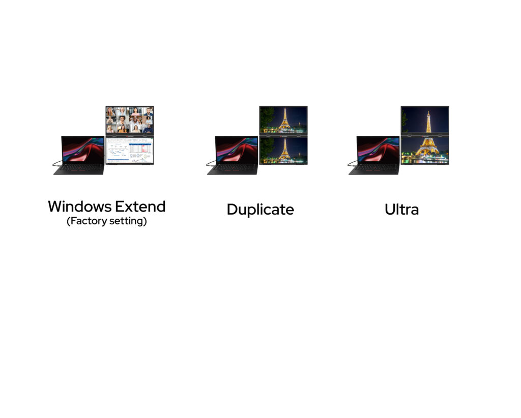 由於 HDMI 技術限制僅能管理一個外接螢幕,雙螢幕便攜式顯示器在您的裝置上會被識別為單一螢幕。這代表在顯示器的鏡像與延伸模式下,兩個螢幕將顯示相同畫面,如同鏡像模式。但在 Ultra 模式下,則可如預期般延伸解析度至雙螢幕。