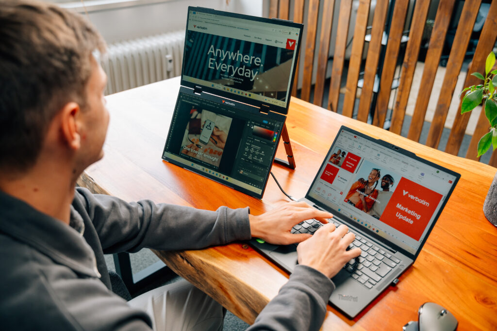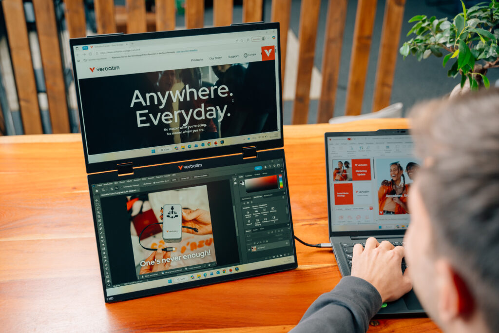 無論在辦公室、居家工作或外出,Verbatim 15.6 吋 FHD 雙螢幕便攜式顯示器 Essentials 提供靈活且精巧的解決方案,讓工作空間瞬間擴展。它採用兩塊垂直堆疊的螢幕,並支援多種顯示模式,包括延伸*、鏡像與 Ultra 模式,可無縫適應您的工作流程。憑藉其纖薄輕巧的設計,您可以在不佔用過多空間的情況下最大限度地提高工作效率。